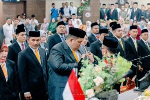 SUBULUSSALAM – Ade Fadly Pranata Bintang, S. Ked didapuk sebagai ketua sementara DPRK Subulussalam usai dilantik dalam pengucapan sumpah dan janji anggota dewan periode 2024-2029 di Gedung DPRK, Senin, 19 Agustus 2024.