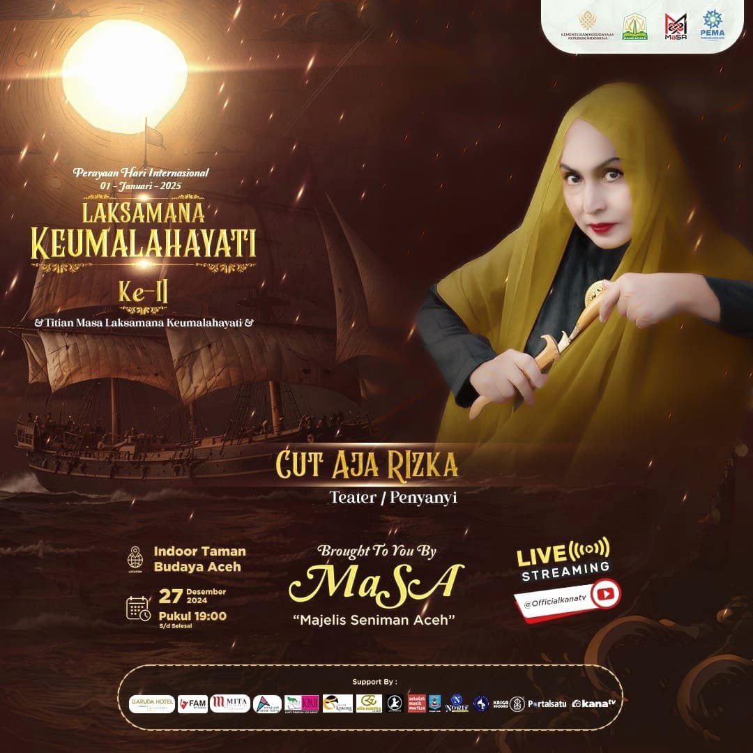 BANDA ACEH – Majelis Seniman Aceh (MaSA), menjadwalkan acara tahunan, Perayaan Internasional Laksamana Keumalahayati ke-2. Puncak acara tersebut rencana dilaksanakan pada 27 Desember 2024, pukul 20.00 WIB sampai selesai, di Gedung Teater Tertutup Taman Budaya, Banda Aceh.