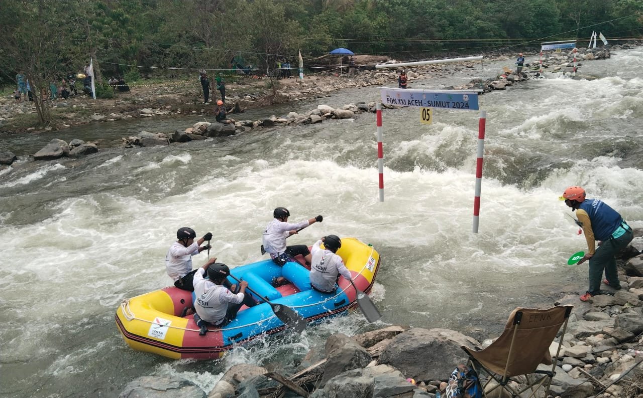 KUTACANE – Tim arung jeram Aceh menambah medali perunggu dari nomor lomba Slalom R4 putra PON XXI Aceh-Sumut, di Sungai Mamas, Jambur Mamang, Aceh Tenggara, Rabu, 18 September 2024.