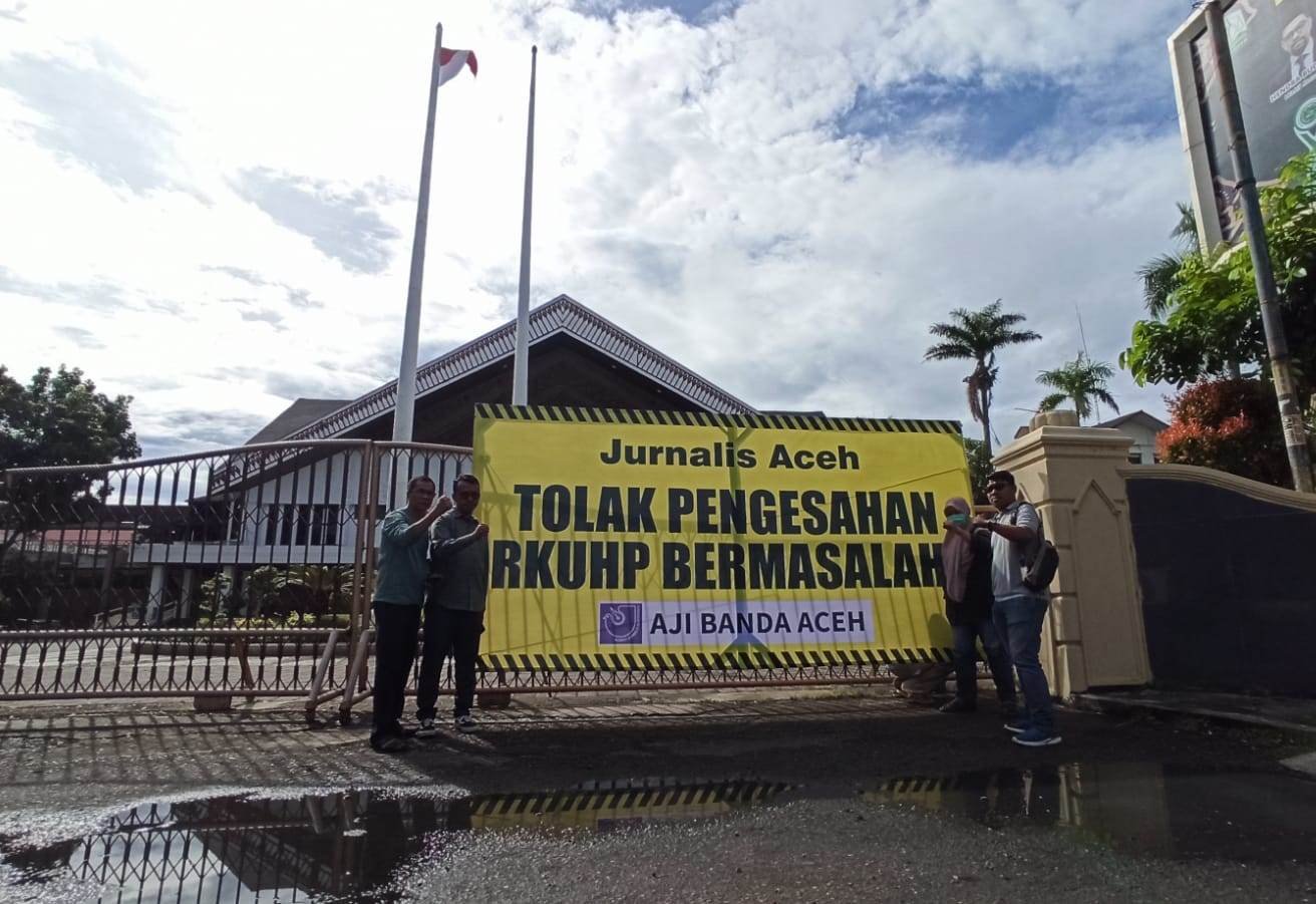 [AJI Banda Aceh memasang papan spanduk di depan Kantor DPR Aceh sebagai bentuk penolakan terhadap pengesahan RKUHP yang akan disahkan DPR RI, Selasa, 6 Desember 2022. Foto: AJI Banda Aceh]