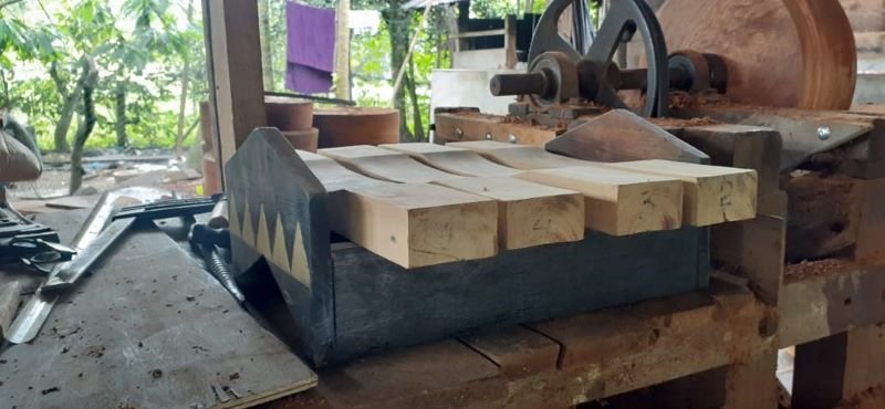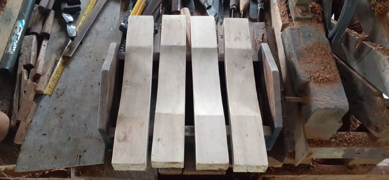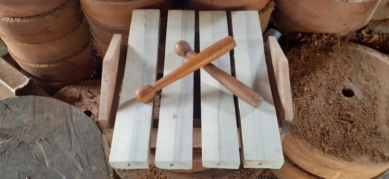 Gambar 1: Proses pembuatan Canang Ceureukeh dengan bahan dasarnya kayu yang berjumlah 4 (empat) bilah dengan lekukan di bagian masing-masing bilahnya. Pada lekukan ini merupakan media yang dipukul sehingga menghasilkan suara yang khas dan bunyi yang nyaring. Canang Ceureukeh. @Ali Mursalan