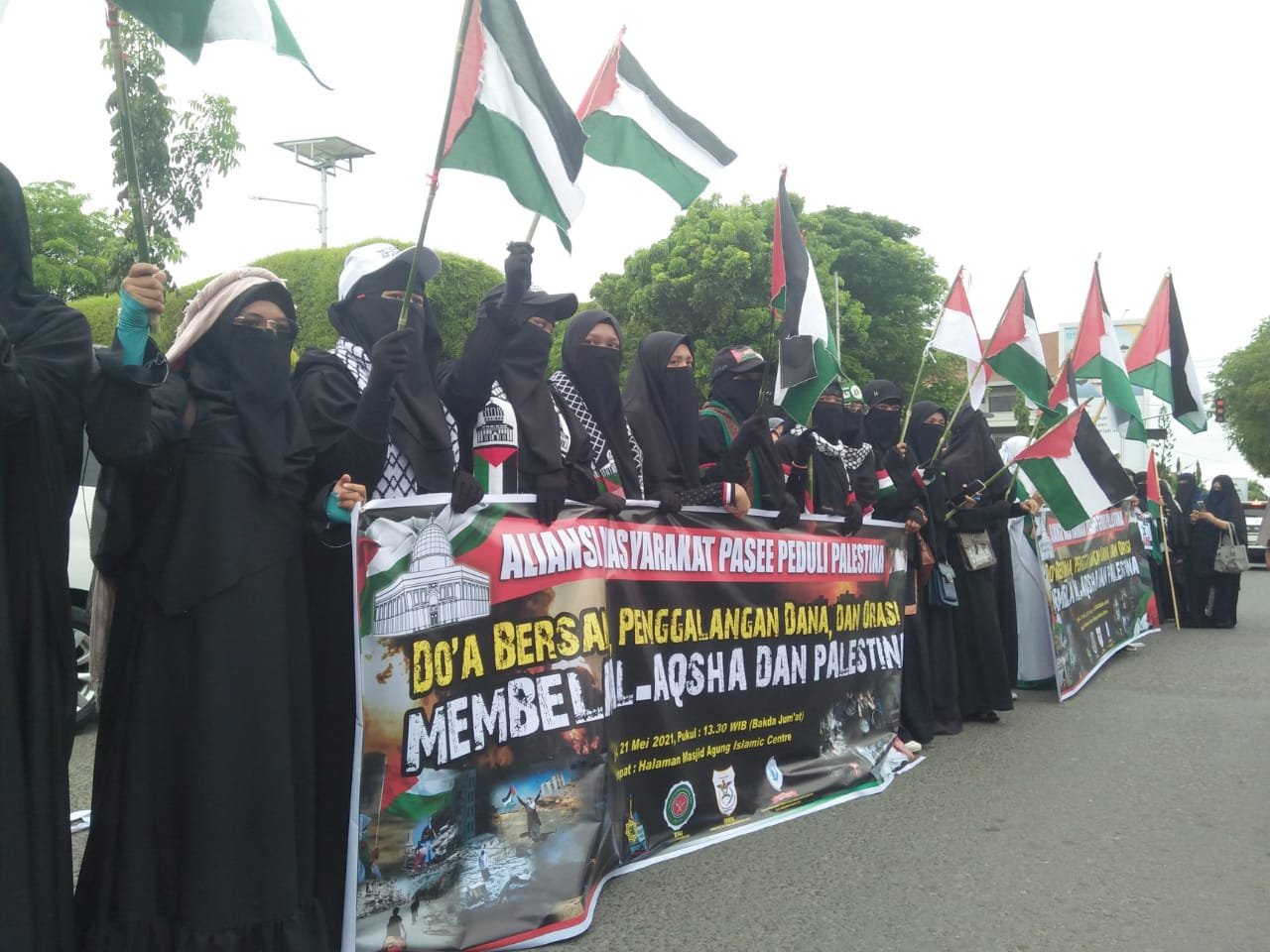Massa aksi turut membawa poster bertuliskan, “Doa bersama, penggalangan dana, dan orasi membela Al-Aqsha dan Palestina”. Aksi itu dikawal personel Polres Lhokseumawe.