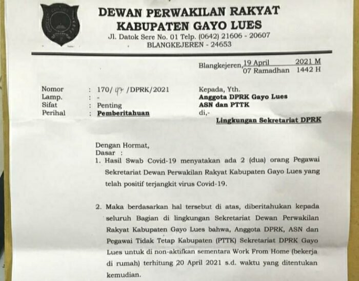 “Hasil swab covid-19 menyatakan ada dua orang pegawai Sekretariat Dewan Perwakilan Rakyat Kabupaten Gayo Lues yang telah positif terjangkit Covid-19,” bunyi poin ke-1 surat tersebut.