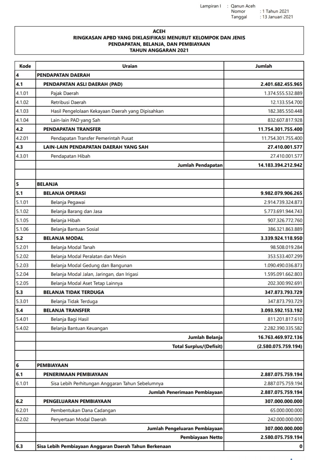 Dilihat portalsatu.com/ pada Daftar Perkembangan Rancangan APBD Seluruh Provinsi TA 2021, dipublikasi laman resmi Ditjen Bina Keuangan Daerah Kementerian Dalam Negeri, Aceh salah satu dari sejumlah provinsi yang penetapan Perda APBD 2021 tidak tepat waktu lantaran melampaui tahun 2020. Qanun Aceh Nomor 1 Tahun 2021 tentang APBA TA 2021 ditetapkan pada 13 Januari 2021.