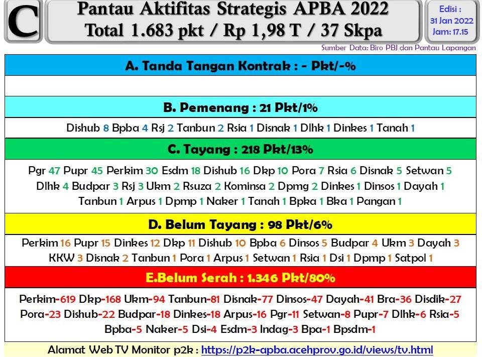 Data ‘Pantau Aktivitas Strategis APBA 2022’, total 1.683 paket senilai Rp1,98 T di 37 SKPA, sampai 31 Januari, sebanyak 21 paket atau 1% sudah ditetapkan pemenang tender. Sementara 218 paket telah tayang (dalam proses tender), 98 paket belum tayang, dan 1.346 paket (80%) belum diserahkan dokumen oleh SKPA terkait ke Unit Layanan Pengadaan (ULP) Barang/Jasa Pemerintah Aceh.
