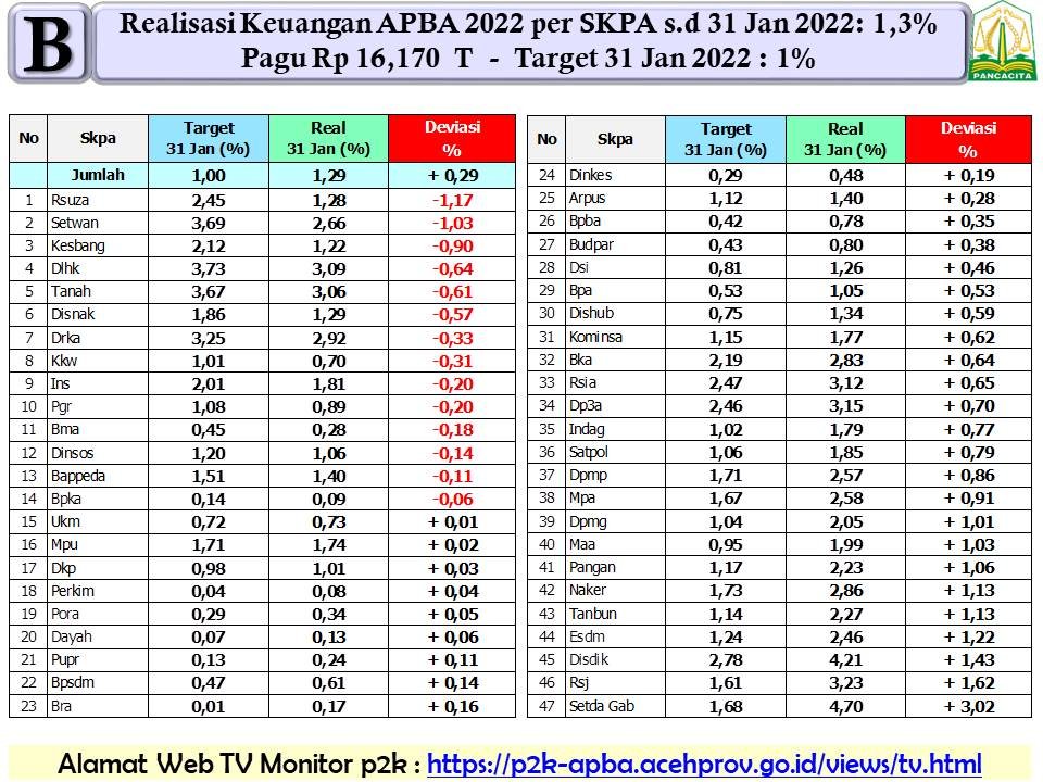 Data dilihat portalsatu.com/ pada laman resmi Percepatan dan Pengendalian Kegiatan Anggaran Pendapatan dan Belanja Aceh (P2K-APBA), Rabu, 2 Februari 2022, selama satu bulan lalu baru terealisasi belanja operasi Pemerintah Aceh.