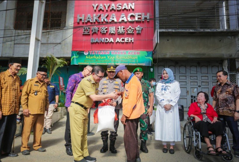 BANDA ACEH – Pj Wali Kota Banda Aceh, Bakri Siddiq menyerahkan secara simbolis paket sembako Ramadan kepada warga Kota Banda Aceh yang kurang mampu bersama pengurus Yayasan Hakka Aceh, Senin, 3 April 2023.