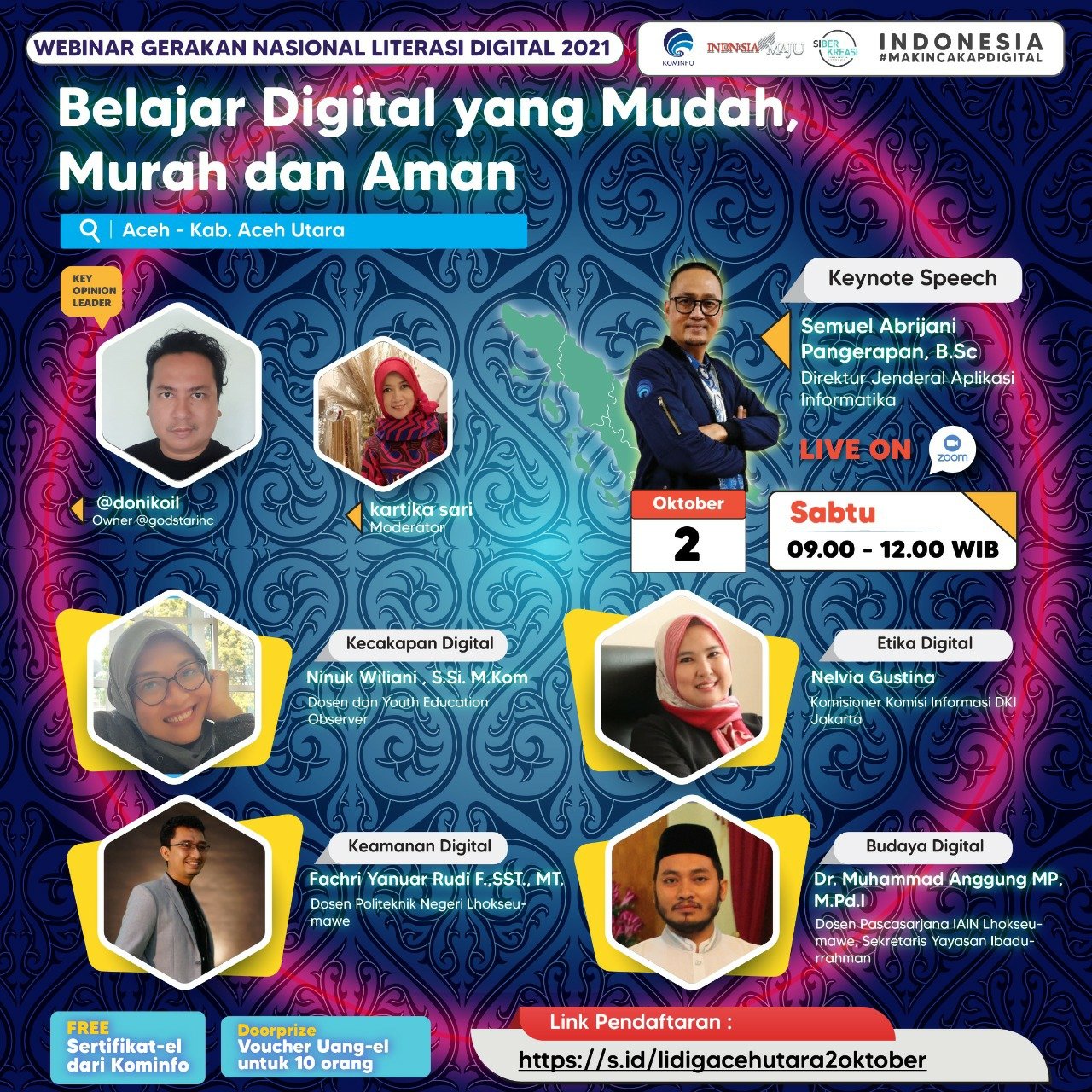 LHOKSUKON – Rangkaian Webinar Literasi Digital di Kabupaten Aceh Utara, Provinsi Aceh kembali bergulir. Pada Sabtu, 2 Oktober 2021 pukul 09.00 hingga 12.00 WIB, telah dilangsungkan webinar bertajuk “Belajar Digital yang Mudah, Murah, dan Aman”.