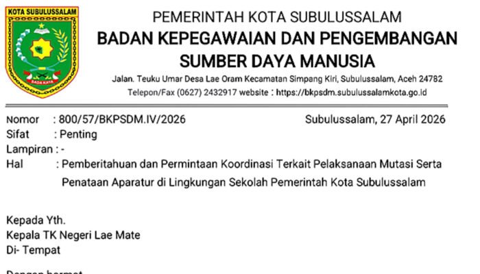 Adapun surat yang beredar dengan nomor: 800/57/BKPSDM.IV/2026 terkait pemberitahuan dan permintaan koordinasi, terkait pelaksanaan mutasi serta penataan aparatur di lingkungan sekolah pemerintah Kota Subulussalam, bukan produk BKPSDM, surat itu dinyatakan hoaks.