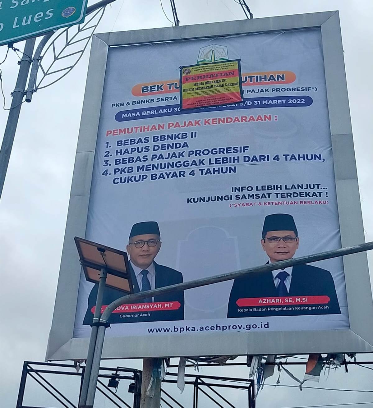 Menariknya, salah satu papan reklame yang “dipalang” oleh Bidang Pendapatan BPKK Gayo Lues adalah baliho milik Badan Pengelolaan Keuangan Aceh (BPKA) berisi informasi tentang pemutihan pajak kendaraan. Baliho tersebut menampilkan gambar Gubernur Aceh Nova Iriasyah dan Kepala BPKA Azhari.