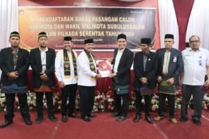 Tiba di Aula KIP, BISA langsung dipeusijuk oleh lima komisioner sebelum prosesi penyerahan berkas persyaratan bakal calon Wali Kota/Wakil Wali Kota Subulussalam periode 2024-2029.