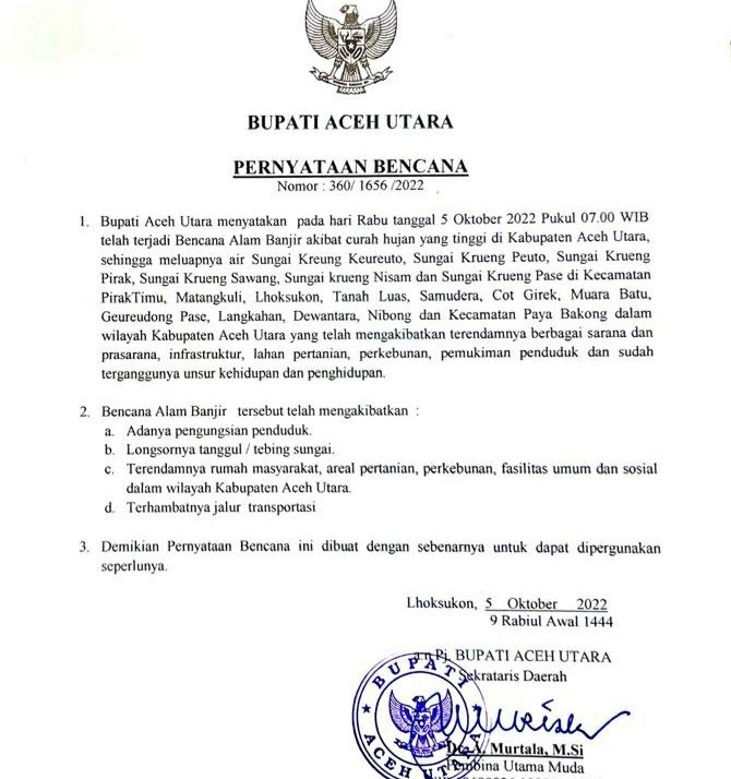 Dalam surat itu, Bupati Aceh Utara menyatakan pada Rabu, 5 Oktober 2022, pukul 07.00 WIB, telah terjadi bencana alam banjir akibat curah hujan yang tinggi, sehingga meluapnya air Sungai Krueng Keureuto, Krueng Peuto, Krueng Pirak, Krueng Sawang, Krueng Nisam, dan Krueng Pase, di Kecamatan Pirak Timu, Lhoksukon, Tanah Luas, Samudera, Cot Girek, Muara Batu, Geureudong Pase, Langkahan, Dewantara, Nibong, dan Paya Bakong, Kabupaten Aceh Utara.