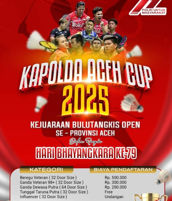 Kejuaraan Badminton Kapolda Aceh Cup 2025 Segera Digelar, Total Hadiah Rp60 Juta