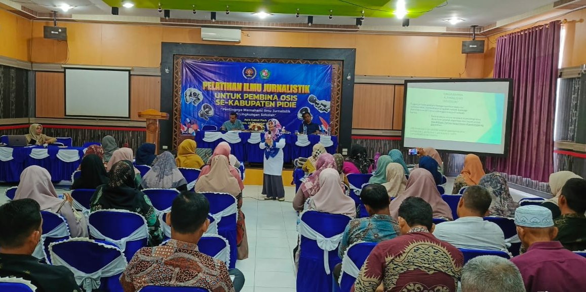 SIGLI – Puluhan guru atau ‘cek gu‘ pembina Organisasi Siswa Intra Sekolah (OSIS) di Kabupaten Pidie ikut pelatihan jurnalistik, Selasa, 24 Desember 2024, di Aula Suman Mark, Sigli.