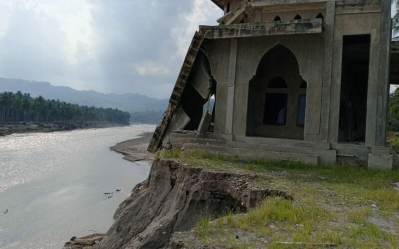 Pemandangan paling menyayat hati terlihat pada bangunan rumah ibadah di desa tersebut. Separuh bangunannya telah runtuh, menampakkan tulang-tulang beton yang patah, sementara arus sungai terus mengintip tepat di bawah pondasi yang tersisa. Kehancuran bangunan suci ini seakan menjadi pesan bisu bahwa alam tak lagi mampu membendung beban yang diberikan manusia.