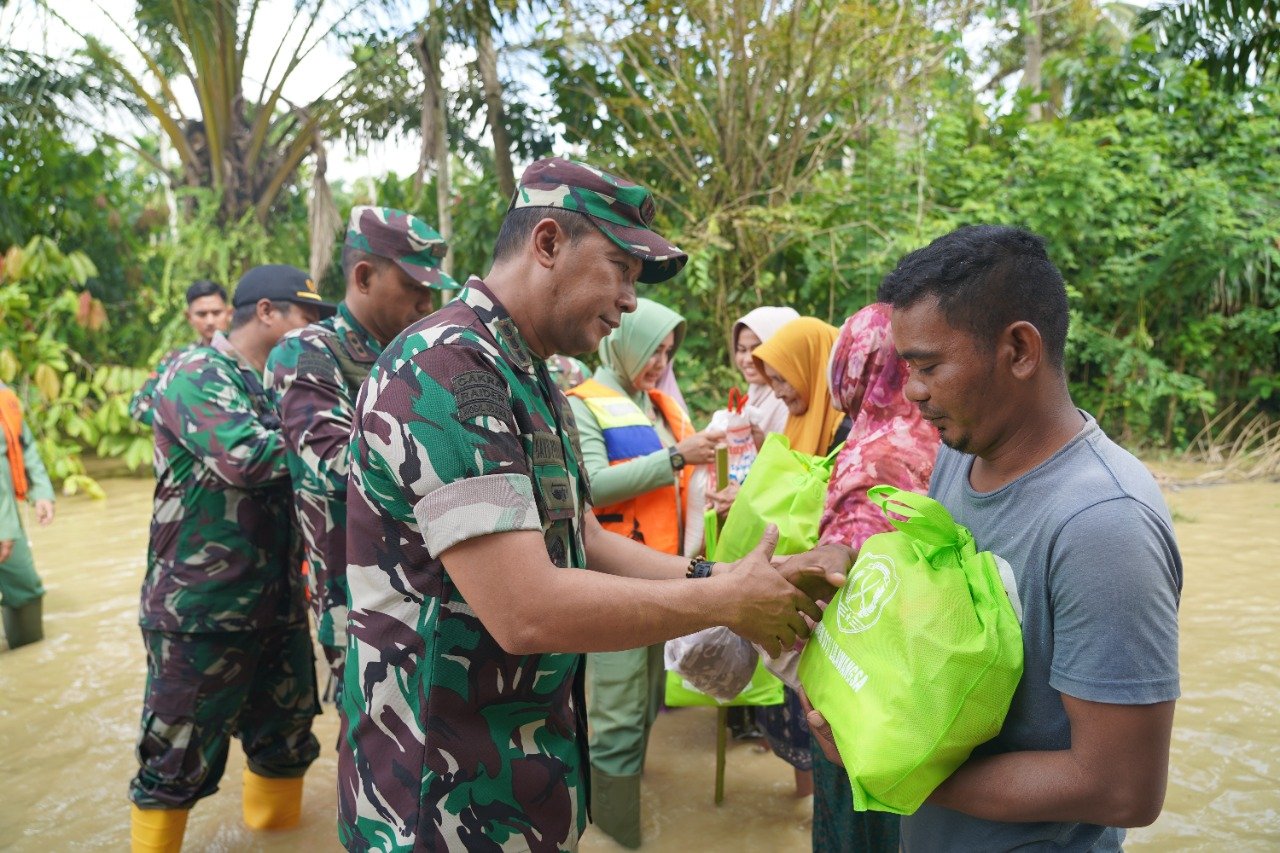 Di lokasi banjir, Danrem berjalan dalam genangan air bercampur lumpur untuk menemui warga dan keluarga prajurit TNI. Usai shalat Jumat bersama masyarakat di masjid setempat, Danrem menyerahkan bantuan kepada warga dan keluarga prajurit yang terdampak banjir.