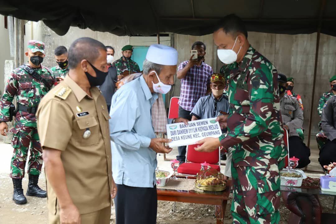 Selain peresmian rumah dinas prajurit TNI, Danrem Baskoro didampingi Dandim Pidie menyerahkan bantuan 50 sak semen untuk masjid Desa Keune, Kecamatan Geumpang yang diterima Abu Keune.[](*)