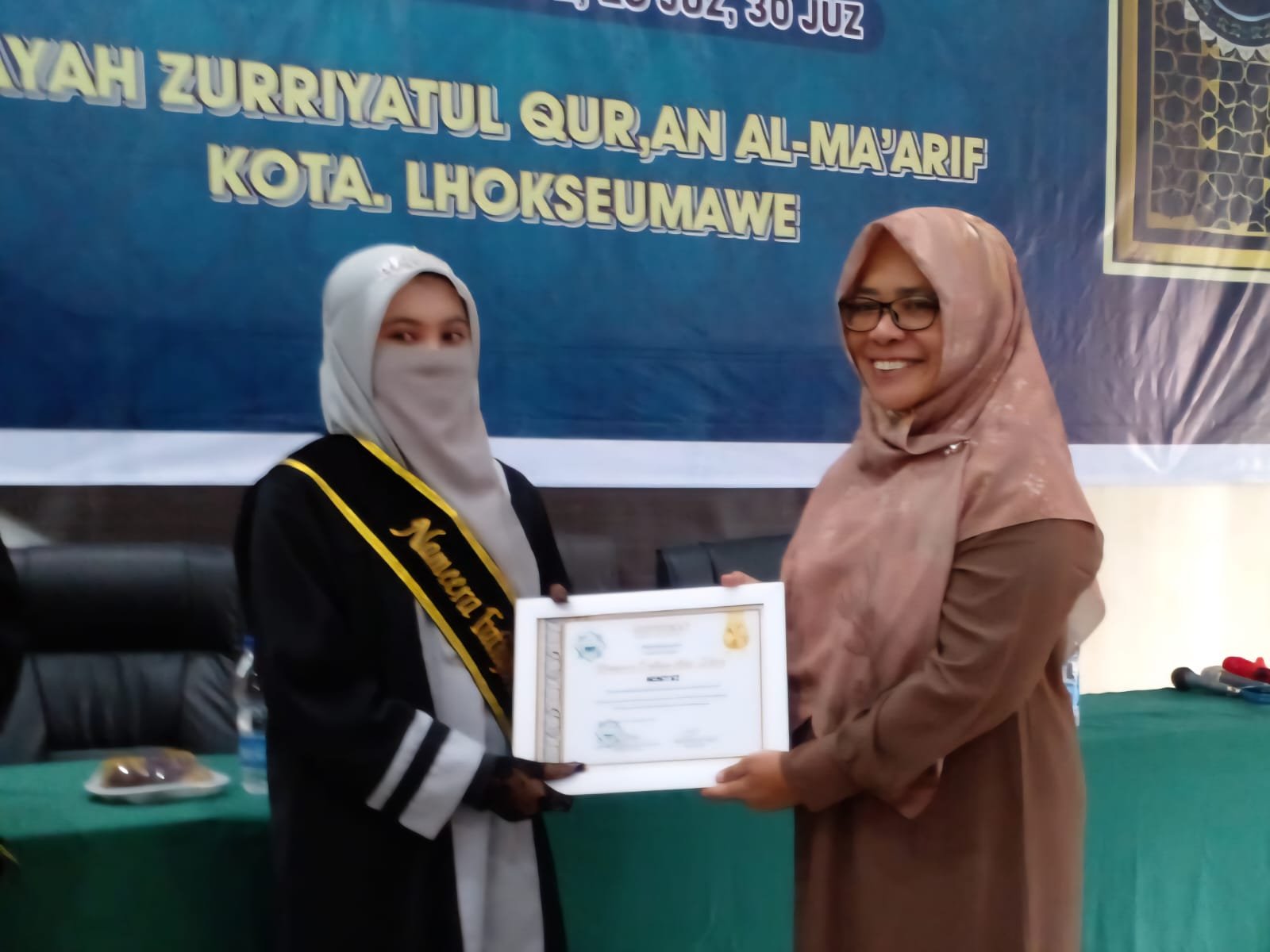 [Project Manager MER-C Aceh Ira Hadiati mendapat kepercayaan menyerahkan ijazah kepada Husnul Khatimah sebagai hafidzah 27 juz dalam wisuda di Dayah ZQA Lhokseumawe pada Ahad, 14 September 2025. Foto: Istimewa]