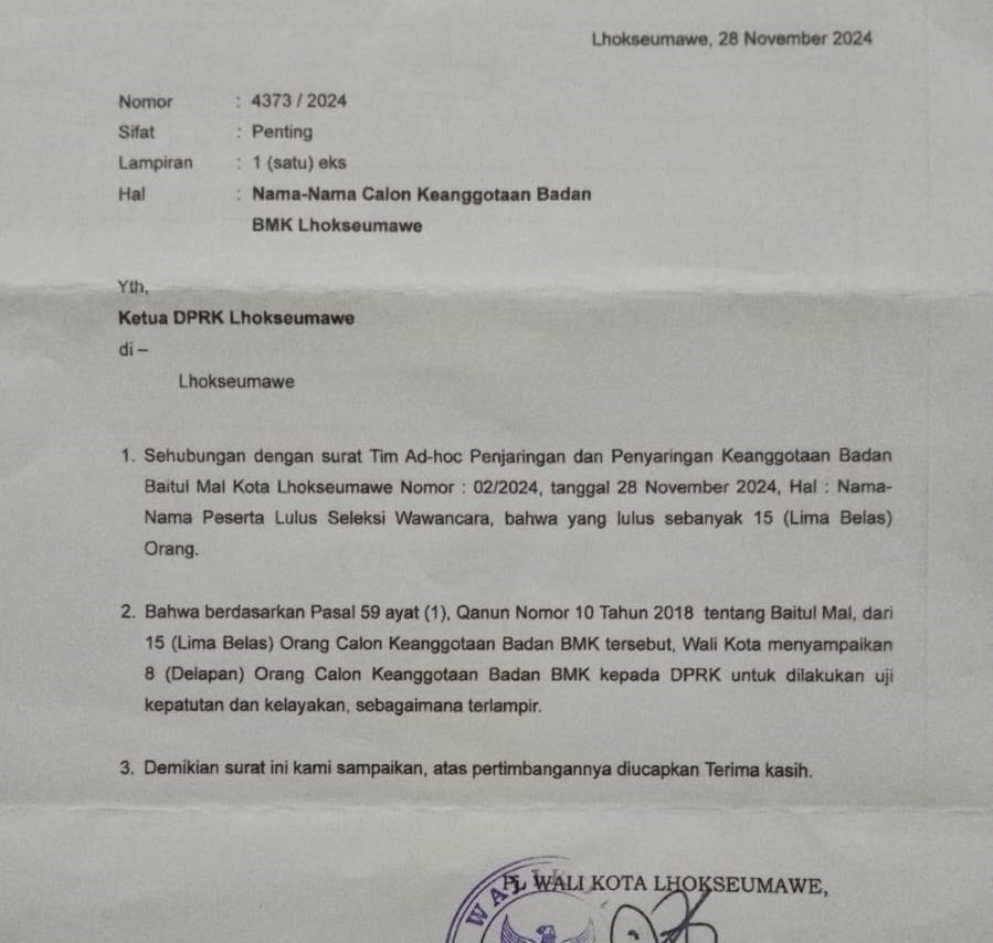 Surat diteken Pj. Wali Kota Lhokseumawe, A. Hanan, itu Nomor: 4373/2024, Sifat: Penting, hal: Nama-nama Calon Keanggotaan Badan BMK.