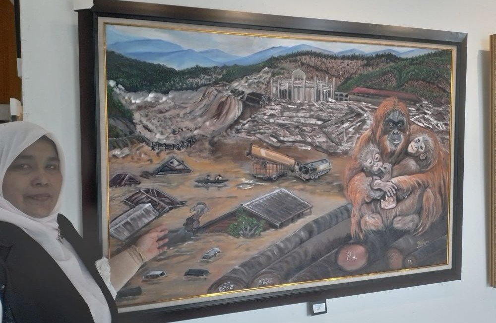 Kemudian baru kutahu itu ialah Bunda Yusra yang lukisannya termasuk yang telah kuperhatikan dengan seksama di dalam ruang pameran tadi. Salah satu lukisannya sesuai tajuk pameran ini, tentang bencana banjir raya akhir 2025 lalu.