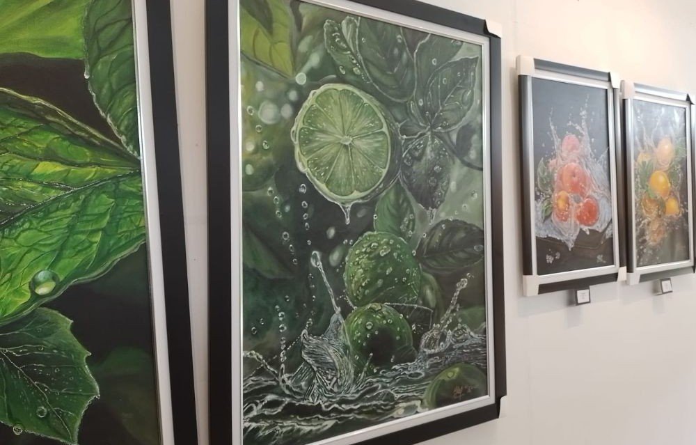 Pertama, lukisan boh kuyuen (jeruk nipis) yang dilukis Bunda Yusra. Itu buah yang berasa masam, tetapi di lukisan, itu menjadi buah masam yang terlihat indah.