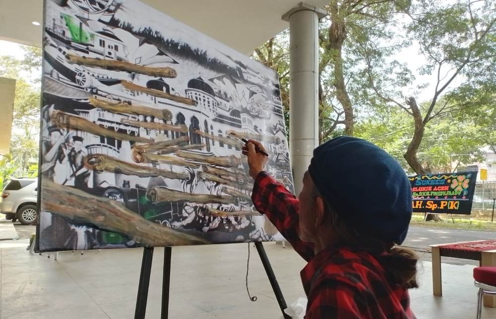 Terlihat pelukis Zul MS tengah menggurat sebuah salinan lukisannya dengan cat berwarna coklat. Dia menambahkan gambar bebatang kayu di permukaan salinan lukisan berlatar Masjid Raya Baiturrahman Banda Aceh, yang bersejarah.