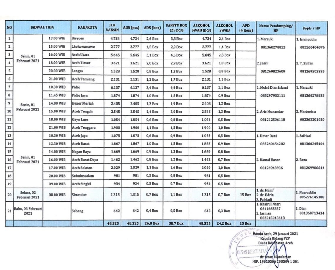 “Setiap kabupaten/kota itu sudah terlampir jumlah vaksin diterima Dinkes setempat. Tadi pelepasannya ke wilayah Timur, Barat Selatan, wilayah Tengah dan lainnya,” kata Kepala Dinas Kesehatan Aceh, dr. Hanif, melalui Kasi Pencegahan dan Pengendalian Penyakit Menular (P2PM) Dinkes, Helmi, SKM., MPH., dihubungi portalsatu.com/ via telepon seluler.