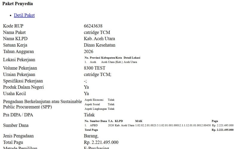 Data tersebut tercantum pada Rencana Umum Pengadan (RUP) Dinkes Aceh Utara dalam daftar paket penyedia. Paket cartridge TCM itu dengan volume pekerjaan mencapai 8.300 tes.