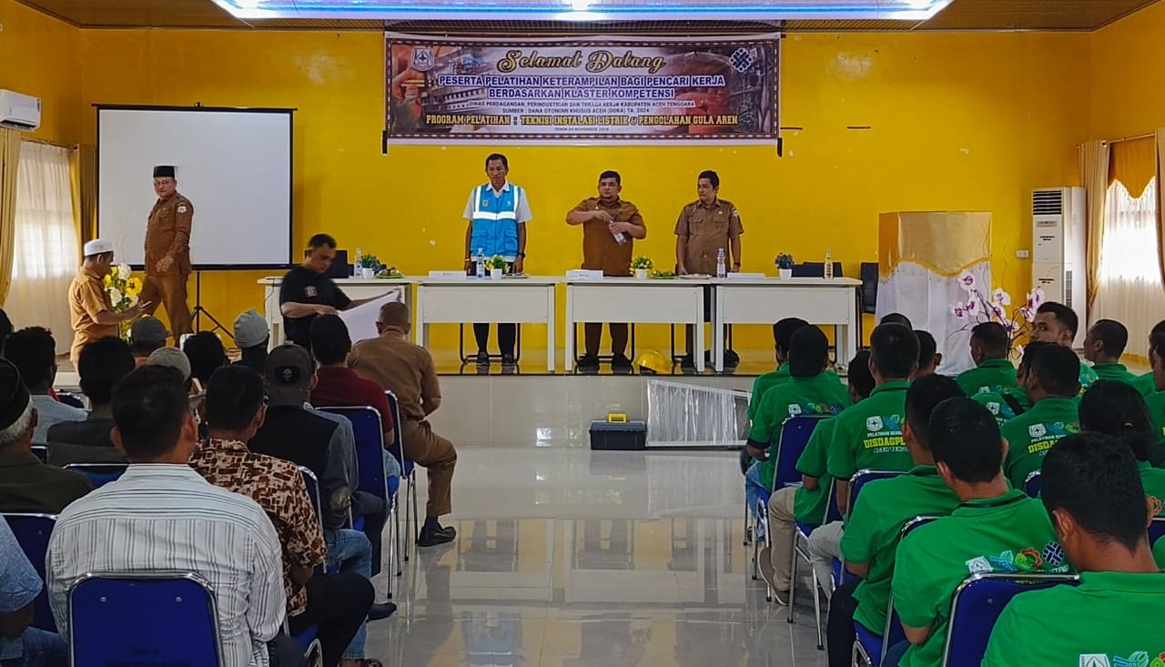 KUTACANE – Dinas Perdagangan, Perindustrian dan Tenaga Kerja (Disdagperinaker) Aceh Tenggara menggelar pelatihan keterampilan instalasi listrik dan pengolahan gula aren bagi para pencari kerja, di Aula SMKN 2 Kutacane, Senin, 4 November 2024.