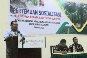 SUBULUSSALAM – Dinas Pertanian Perkebunan dan Perinkanan (Distanbunkan) Kota Subulussalam melaksanakan Sosialisasi Peremajaan Sawit Rakyat (PSR) di Hotel Hermes One, Jumat, 29 September 2023.