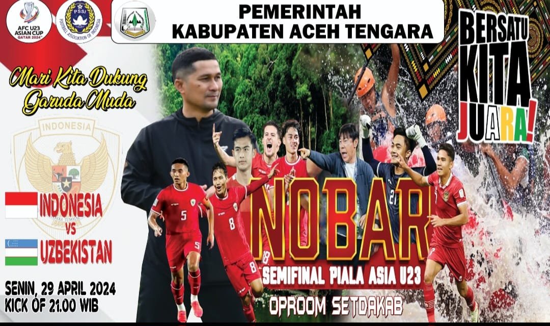 KUTACANE – Pemerintah Kabupaten Aceh Tenggara mengajak seluruh pimpinan OPD dan masyarakat agar Nonton Bareng (Nobar) laga semifinal Piala Asia U-23 Tim Nasional Indonesia melawan Uzbekistan. Nobar akan digelar di Oproom Setda Aceh Tenggara, Senin, 29 April 2024, malam.