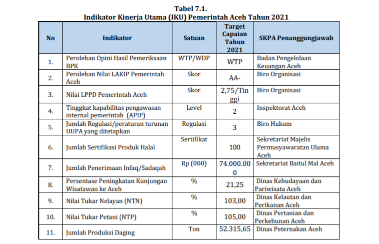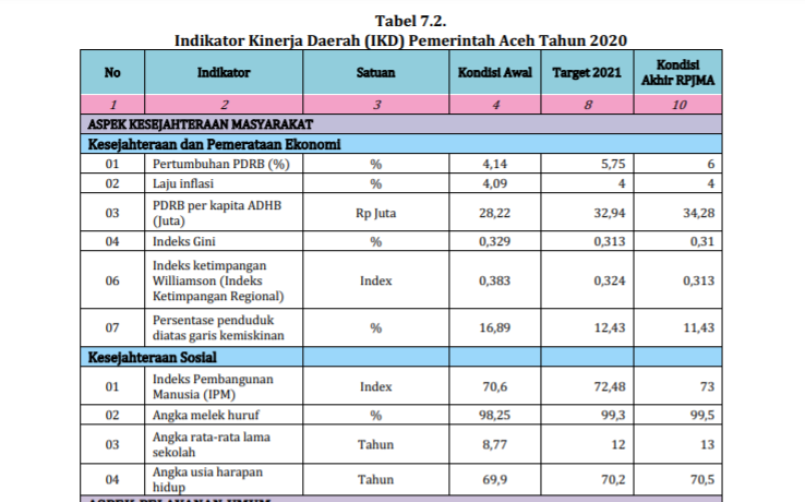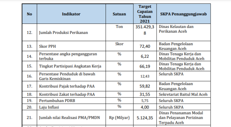 Dalam RKPA 2021, berdasarkan data tabel Indikator Kinerja Utama (IKU) Pemerintah Aceh Tahun 2021, target capaian antara lain Nilai Tukar Nelayan (NTN) 103 persen, Nilai Tukar Petani (NTP) 105 persen, Persentase Angka Pengangguran Terbuka (Tingkat Pengangguran Terbuka/TPT) 6,22 persen, Persentase Penduduk di Bawah Garis Kemiskinan 12,43 persen, dan Pertumbuhan PDRB 5,75 persen.