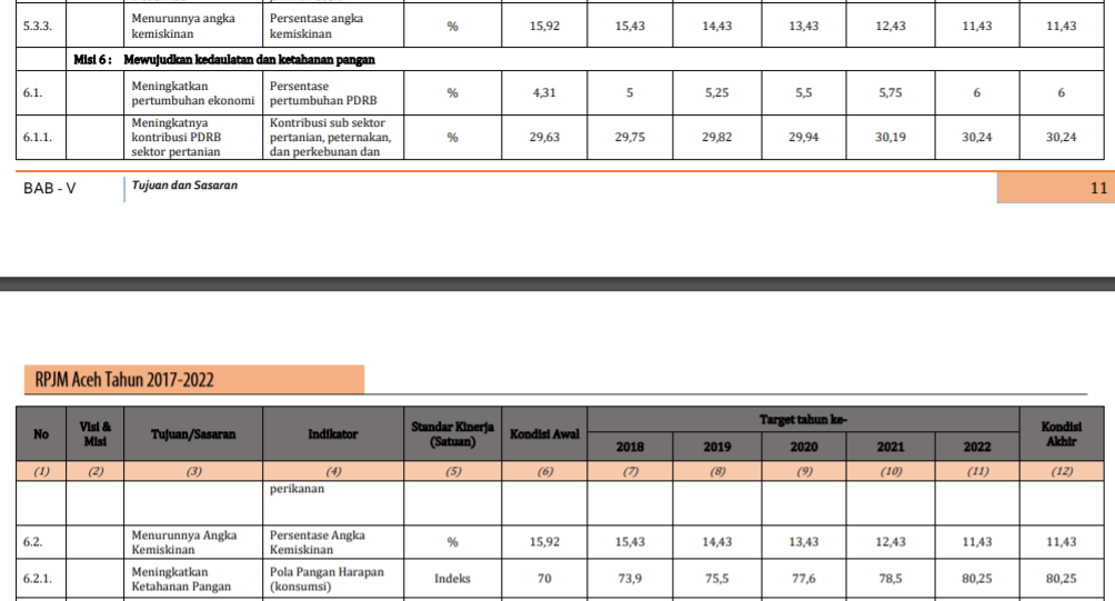 Di antaranya, Misi 6: Mewujudkan kedaulatan dan ketahanan pangan. Misi ini mempunyai lima tujuan/sasaran. Di antaranya, meningkatkan pertumbuhan ekonomi dengan indikator persentase pertumbuhan PDRB. Kondisi awal (2017): 4,31 persen; target tahun 2018: 5 persen; 2019: 5,25 persen; 2020: 5,5 persen, 2021: 5,75 persen, dan 2022: 6 persen.