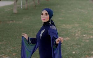 Riza Putri Novia, model perwakilan Aceh Timur, saat menggunakan gaun berwarna biru donker, di Komplek Perumahan PT Perta Arus Gas, Lhokseumawe, Kamis, 28 Januari 2021.