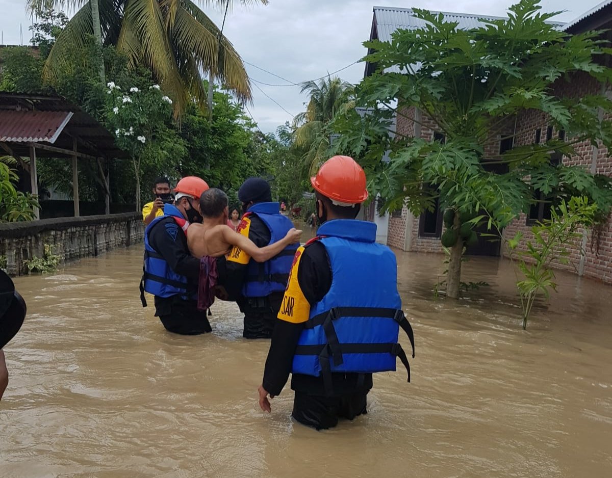 Foto-foto dikirim warga Kecamatan Samudera kepada portalsatu.com/, Jumat sekitar pukul 11.00 WIB, tampak salah seorang pria harus digendong petugas dari rumahnya untuk dievakuasi ke lokasi yang aman.