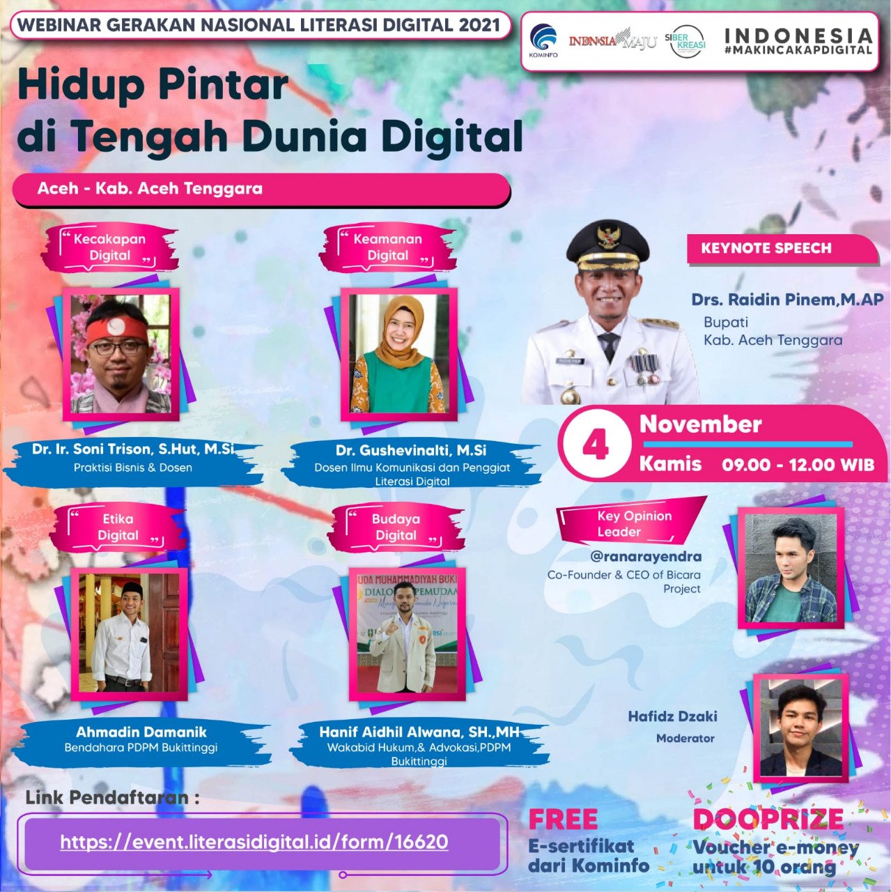 Pada webinar yang menyasar target segmen mahasiswa, guru, dan siswa, dihadiri oleh sekitar 1361 peserta daring ini, hadir dan memberikan materinya secara virtual, para narasumber yang berkompeten dalam bidangnya, yakni Dr. Ir. Soni Trison, S.Hut., M.Si., Praktisi Bisnis & Dosen; Dr. Gushevinalti, M.Si., Dosen Ilmu Komunikasi dan Penggiat Literasi Digital; Hanif Aidhil Alwana, S.H., M.H., Penggiat Literasi; dan Ahmadin Damanik, Bendahara DPD IMM Bukittinggi. Rana Rayendra sebagai Key Opinion Leader (KOL) dan memberikan pengalamannya.