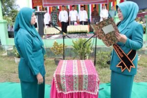 SUBULUSSALAM – Hj. Mariani Harahap, S.E melantik Siti Nur Kalifatun sebagai Ketua TP PKK dan Bunda PAUD Kecamatan Longkib di Lapangan Sikerabang, Senin, 13 Februari 2023.
