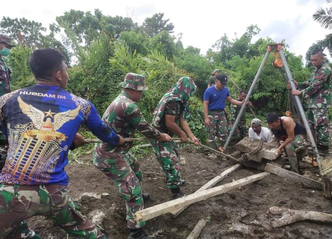 BANDA ACEH – Prajurit Perhubungan Kodam (Hubdam) Iskandar Muda bersama Babinsa Koramil Peukan Bada, personel Polsek Peukan Bada, dan Masyarakat Peduli Sejarah Aceh (Mapesa), meuseuraya membersihkan kompleks makam peninggalan sejarah di Gampong Gurah, Kecamatan Peukan Bada, Kabupaten Aceh Besar, Jumat, 27 Mei 2022. Gotong royong itu sebagai upaya penyelamatan situs sejarah Aceh.
