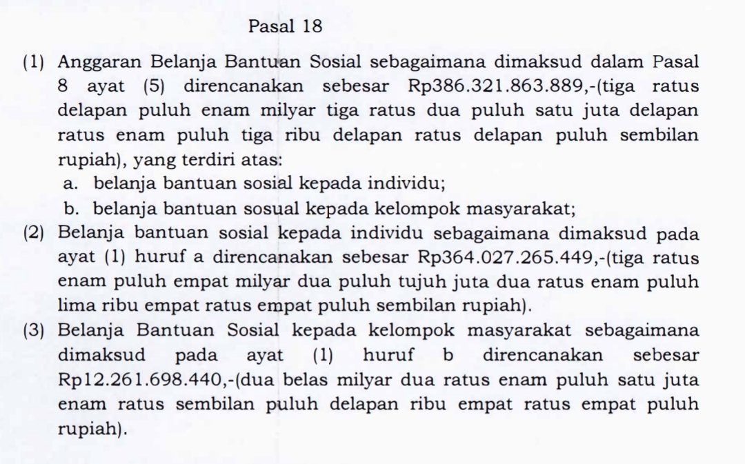 Belanja bantuan sosial dianggarkan dalam APBD sesuai dengan kemampuan Keuangan Daerah setelah memprioritaskan pemenuhan belanja Urusan Pemerintahan Wajib dan Urusan Pemerintahan Pilihan, kecuali ditentukan lain sesuai dengan ketentuan peraturan perulndang-undangan. [](red)