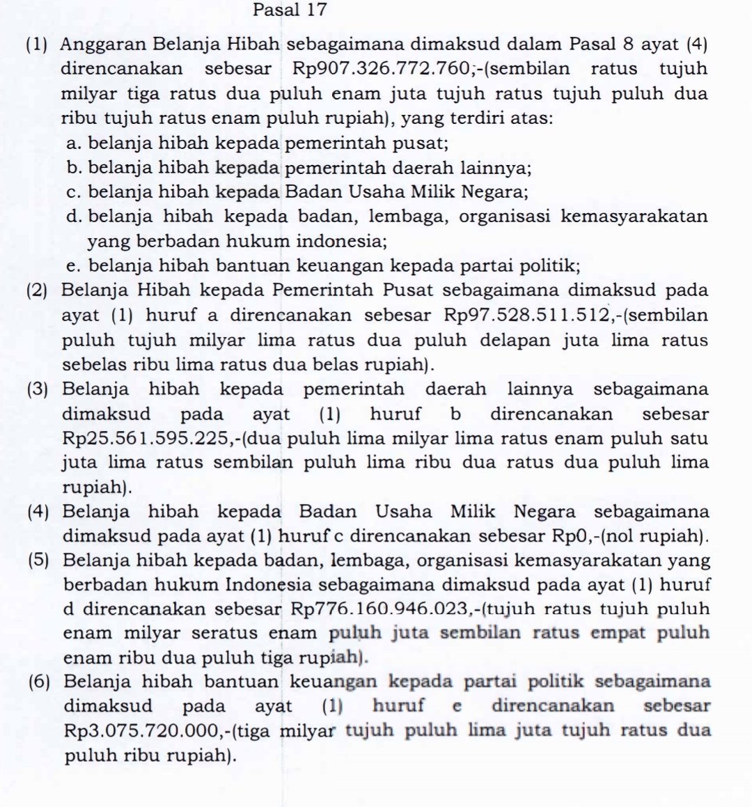 Belanja Hibah Rp907.326.772.760 (907,326 M lebih) terdiri atas belanja hibah kepada pemerintah pusat Rp97,528 M lebih; belanja hibah kepada pemerintah daerah lainnya Rp25,561 M lebih; belanja hibah kepada badan, lembaga, organisasi kemasyarakatan yang berbadan hukum Indonesia Rp776,160 M lebih; dan belanja hibah bantuan keuangan kepada partai politik Rp3,075 M lebih.