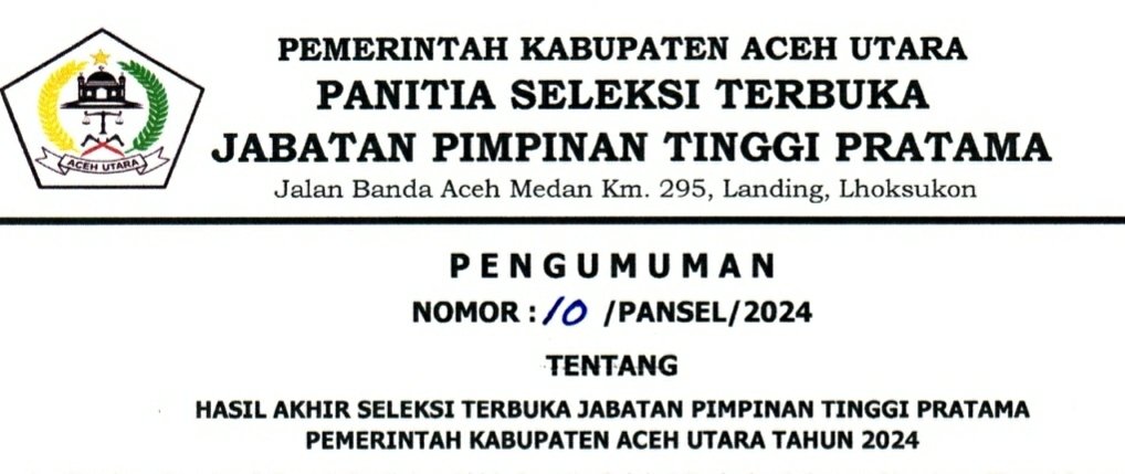 Dalam pengumuman itu disebutkan, tiga nama terbaik calon Pejabat Pimpinan Tinggi Pratama untuk masing-masing jabatan yang diseleksi, diumumkan berdasarkan hasil Rapat Penilaian Akhir Panitia Seleksi Terbuka Jabatan Pimpinan Tinggi Pratama di Lingkungan Pemerintah Kabupaten Aceh Utara Tahun 2024 yang dilaksanakan pada 25 September 2024, serta Surat Kepala Pusat Penilaian Kompetensi ASN Badan Kepegawaian Negara Nomor: 213/B-NK.04/SD/L/2024 tanggal 1 Oktober 2024, Perihal: Hasil Pengawasan Pelaksanaan Penilaian Kompetensi Manajerial dan Sosial Kultural dalam Rangka Seleksi Terbuka Jabatan Pimpinan Tinggi Pratama di Lingkungan Pemerintah Kabupaten Aceh Utara.