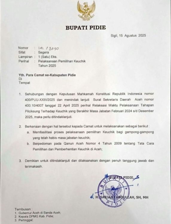 Bupati Pidie, Sarjani Abdullah melalui surat Nomor: 141/3090 tanggal 15 Agustus 2025, meminta para Camat memfasilitasi proses pelaksanaan pemilihan Keuchik bagi gampong-gampong yang telah habis masa jabatan Keuchik.