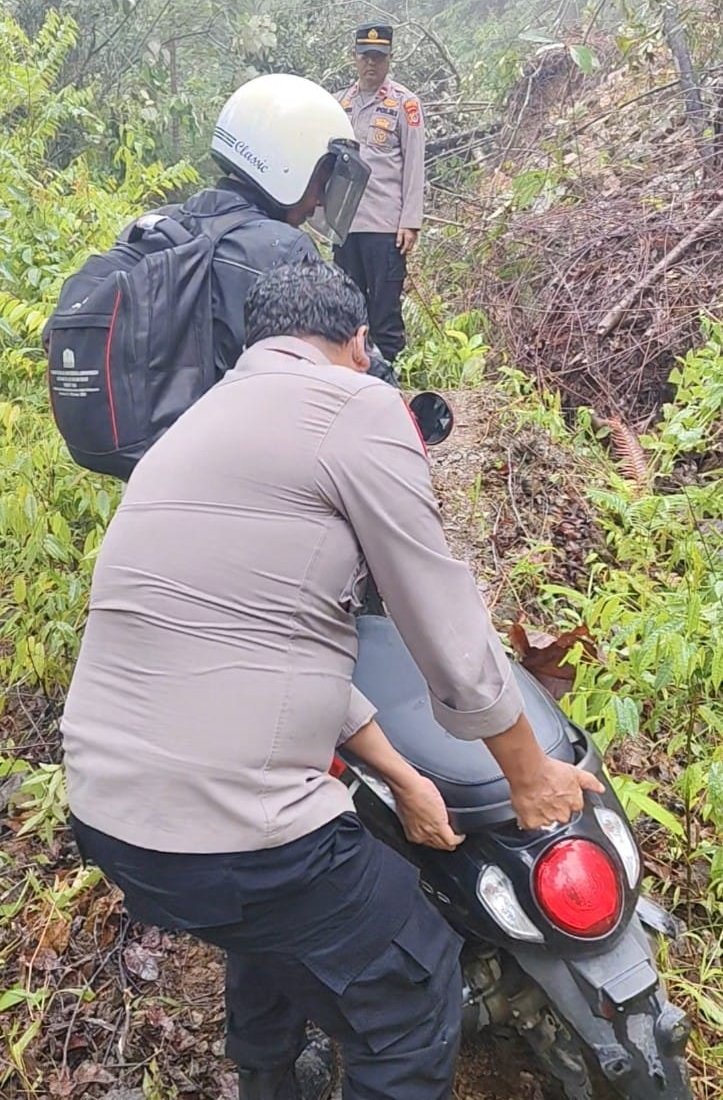 [Polisi membantu pengendara sepeda motor di lokasi tanah longsor Jalan Gayo Lues-Abdya, Sabtu, 12 Oktober 2024. Foto: Istimewa]