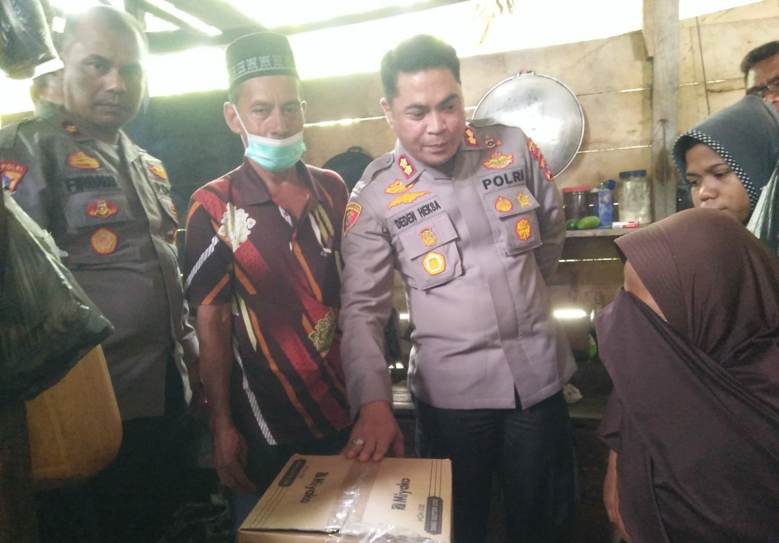 “Dalam waktu dekat kami akan melakukan program bedah rumah swadaya jajaran Polres untuk Ibu Sapiah yang sudah menjanda sekitar dua tahun, karena suaminya meninggal dunia. Kami menemukan rumah ini sejak tiga pekan lalu dalam kondisinya saat itu tidak ada listrik, tidak ada sumber air bersih, sangat memprihatinkan,” ujar Kapolres Deden Heksaputera.