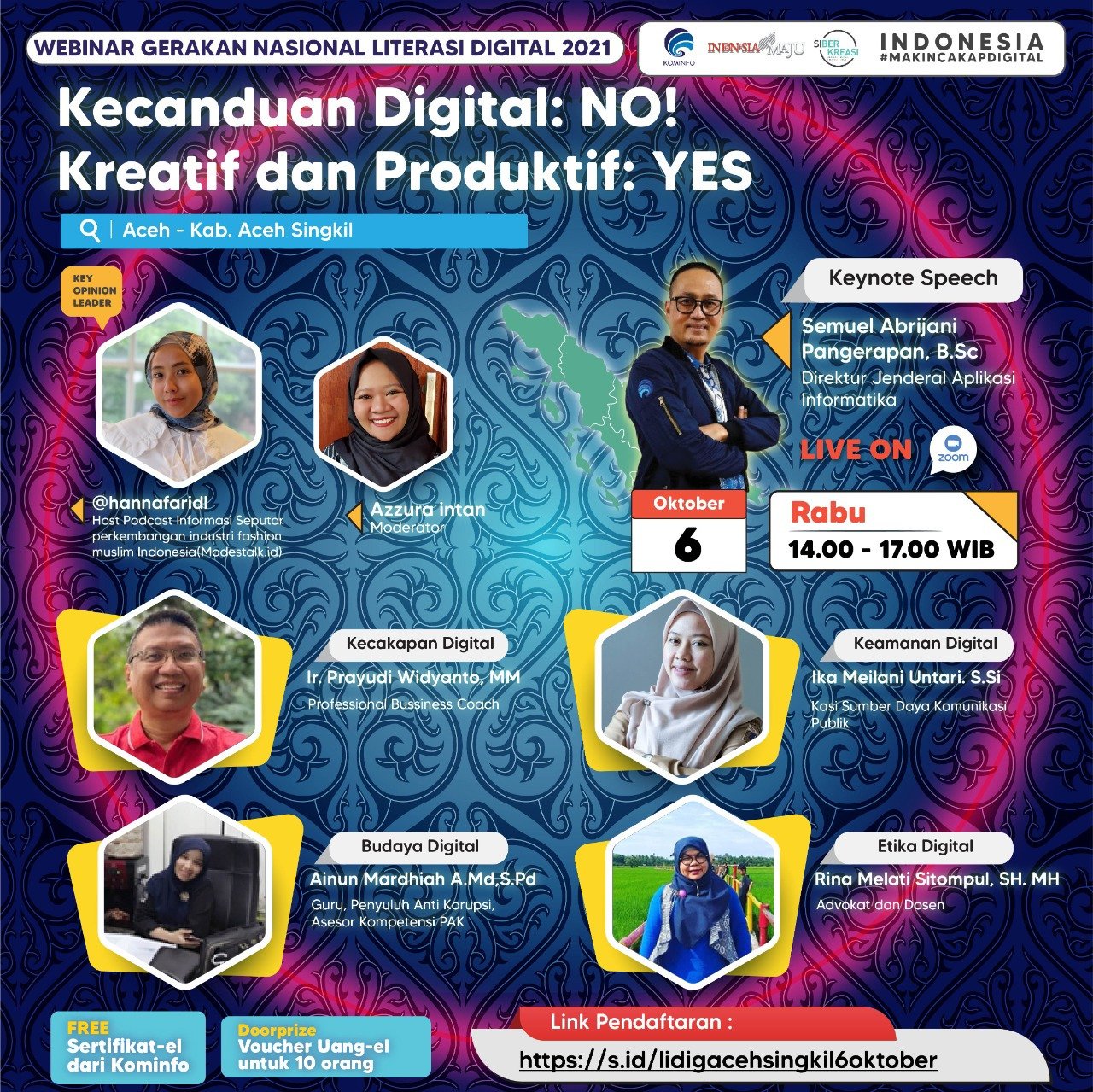SINGKIL – Rangkaian Webinar Literasi Digital di Kabupaten Aceh Singkil, Provinsi Aceh kembali bergulir. Pada Rabu, 6 Oktober 2021 pukul 14.00 hingga 17.00, telah dilangsungkan webinar bertajuk “Kecanduan Digital: No! Kreatif dan Produktif: Yes!”