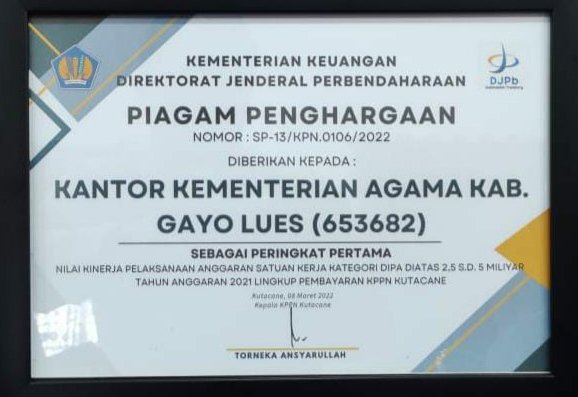 Selain itu, Kantor Kementerian Agama Kabupaten Gayo Lues mendapat penghargaan dari Kementerian Keuangan melalui Direktorat Jenderal Perbendaharaan (DJPB) sebagai peringkat pertama nilai kerja pelaksanaan anggaran 2021 lingkup pembayaran KPPN Kutacane.