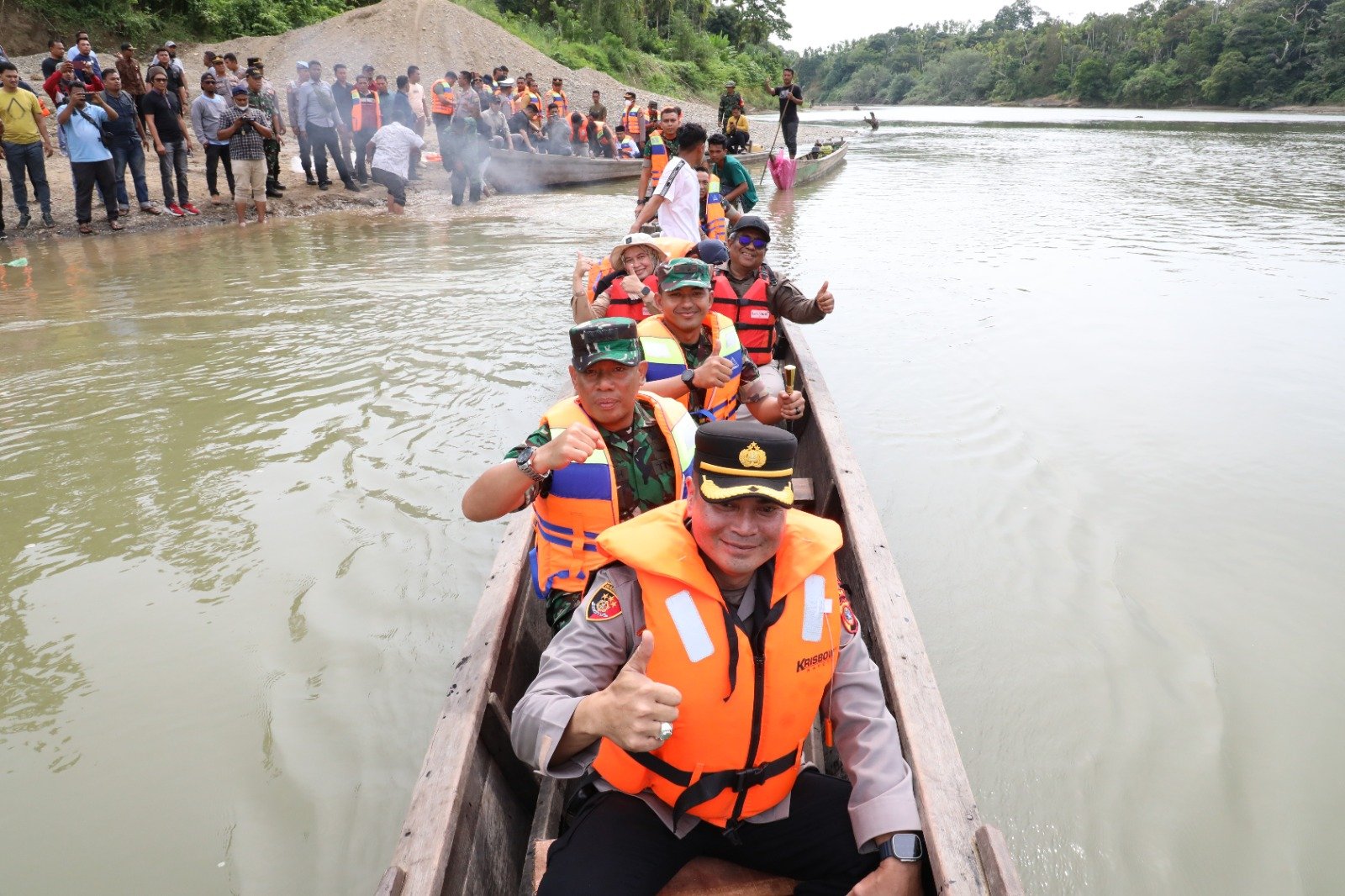 LHOKSUKON – Penjabat Bupati Aceh Utara Dr. Mahyuzar, bersama para pejabat Forkopimda naik perahu mengarungi sungai, dilanjutkan dengan motor trail saat mengunjungi dusun paling terpencil dan terisolir, yakni Sarah Raja di Kecamatan Langkahan, Jumat, 4 Agustus 2023. Kunjungan Pj. Bupati Mahyuzar yang membawa para kepala dinas (kadis) tersebut merupakan bagian dari kegiatan memaksimalkan program percepatan penurunan stunting dan kemiskinan ekstrem di daerah ini.