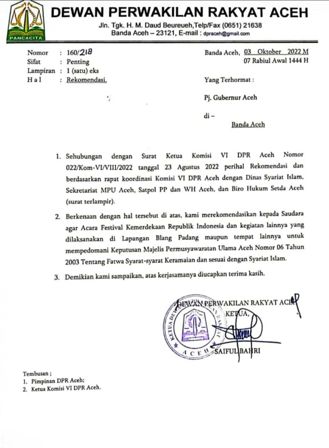 “Kami merekomendasikan kepada saudara agar acara Festival Kemerdekaan Republik Indonesia dan kegiatan lainnya yang dilaksanakan di Lapangan Blang Padang maupun tempat lainnya untuk mempedomani Keputusan MPU Aceh Nomor 06 Tahun 2003 tentang Fatwa Syarat-syarat Keramaian dan sesuai dengan Syariat Islam,” ujar Ketua DPR Aceh, Saiful Bahri dalam sepucuk surat resmi yang dikirimkan kepada Pj Gubernur Aceh, Senin, 3 Oktober 2022.