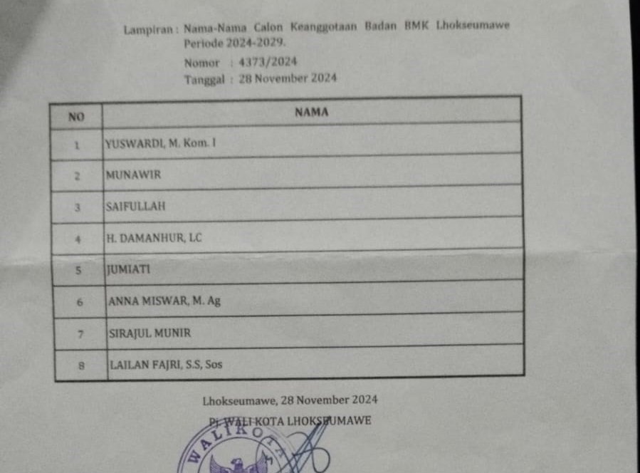 Berdasarkan bukti surat diperoleh portalsatu.com/, surat Pj. Wali Kota Lhokseumawe itu tertanggal 28 November 2024, Nomor: 4373/2024, Sifat: Penting, Hal: Nama-Nama Calon Keanggotaan Badan BMK, ditujukan kepada Ketua DPRK. Dalam lampiran surat Pj. Wali Kota tersebut tercantum delapan nama calon keanggotaan BMK Lhokseumawe periode 2024-2029.