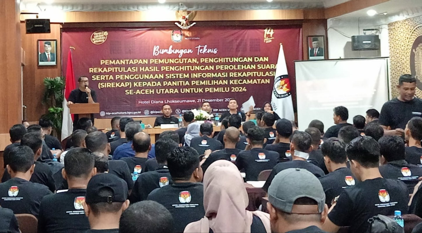 ACEH UTARA – Komisi Independen Pemilihan (KIP) Aceh Utara melakukan bimbingan teknis (Bimtek) pemantapan tentang Pemungutan, Penghitungan dan Rekapitulasi Hasil Penghitungan Perolehan Suara serta Penggunaan Sistem Informasi Rekapitulasi (Sirekap) untuk Pemilu 2024, di Hotel Diana Lhokseumawe, Kamis, 21 Desember 2023.